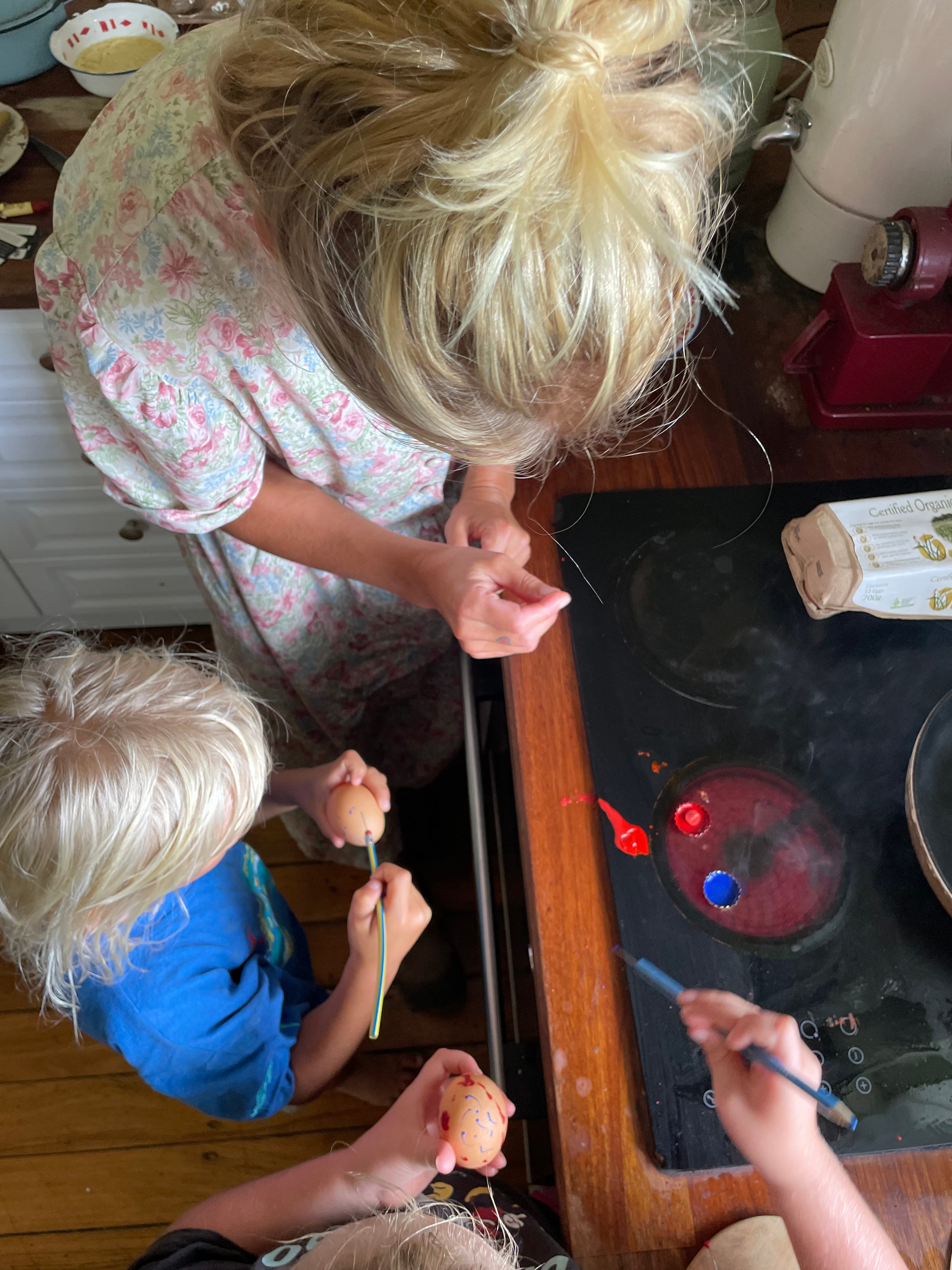 Zuri, Maxine’s older daughter, took to the craft with care, it reminded me how naturally girls are drawn into these small, creative rituals. My boy Luka tried for a little while, dipping in and out, but soon enough he ran off after the chickens, as boys often do.